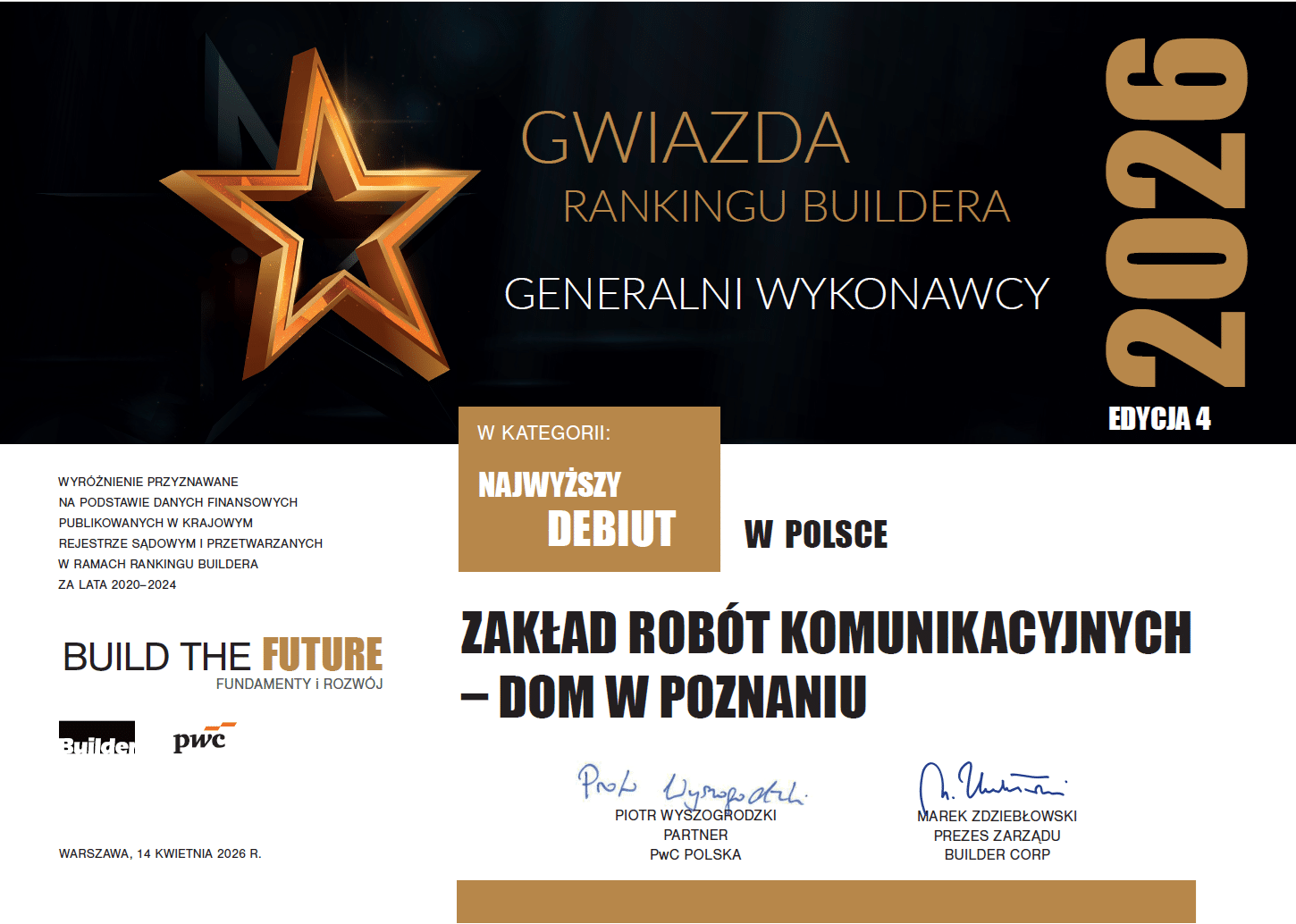 Z przyjemnością dzielimy się wyjątkową wiadomością – nasza Spółka została wyróżniona tytułem „Gwiazda Rankingu Buildera” w kategorii Najwyższy debiut roku w Polsce – generalni wykonawcy.